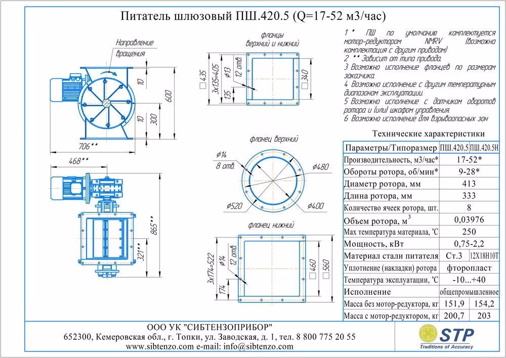 Все сборочные единицы и детали смонтированы в корпусе Питателя Шлюзового ПШ 420.5. Рабочим элементом является ротор, с помощью которого происходит непрерывное (порционное) перемещение материала. Ротор установлен на подшипниковых узлах, которые расположены в крышках.